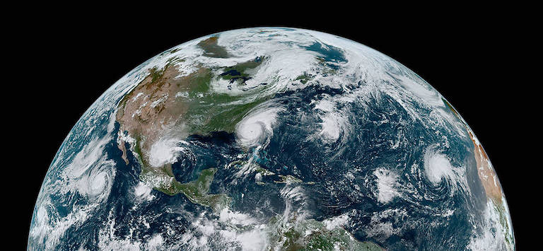 [NASA - Two hurricanes and two tropical storms in the Atlantic basin on September 4, 2019 as seen from the GOES-16 satellite.]