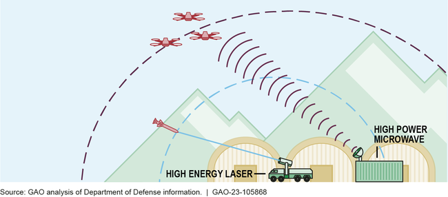 [Notional Depiction of High Power Microwave and High Energy Laser Defending an Installation - The US Department of Defense]